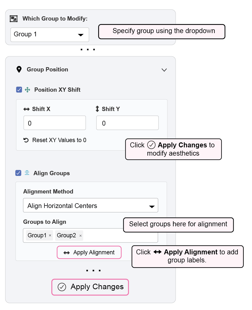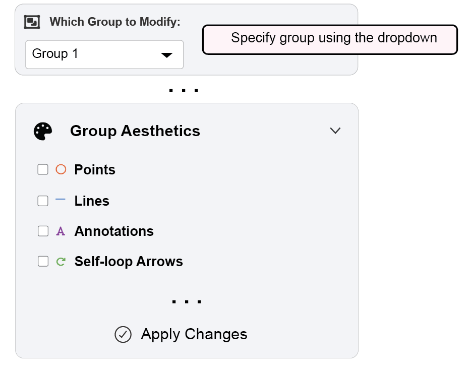 Usage: Select a group from the dropdown menu, then choose the element type(s) you wish to style. All changes apply consistently to all unlocked elements within the selected group after clicking Apply Changes.