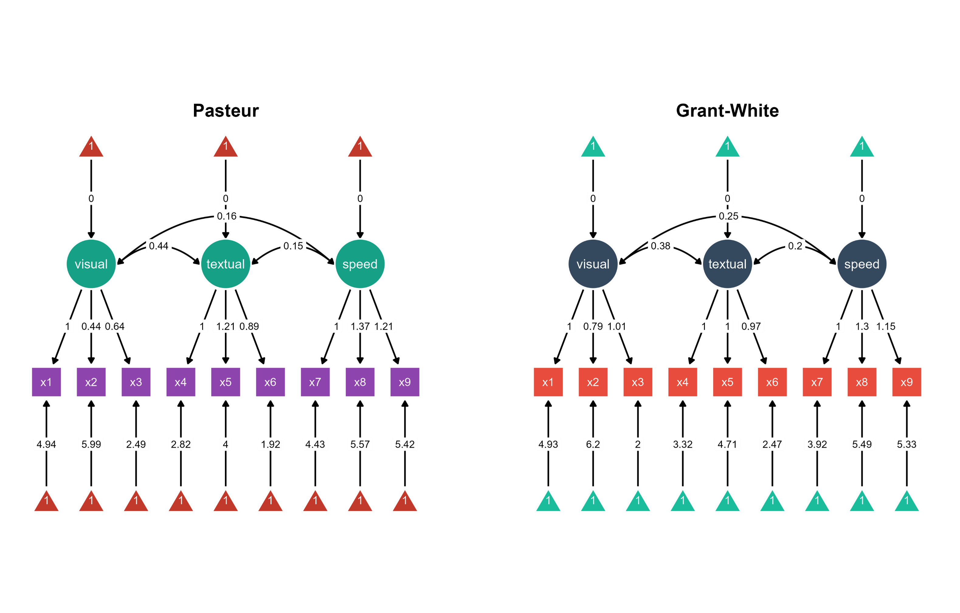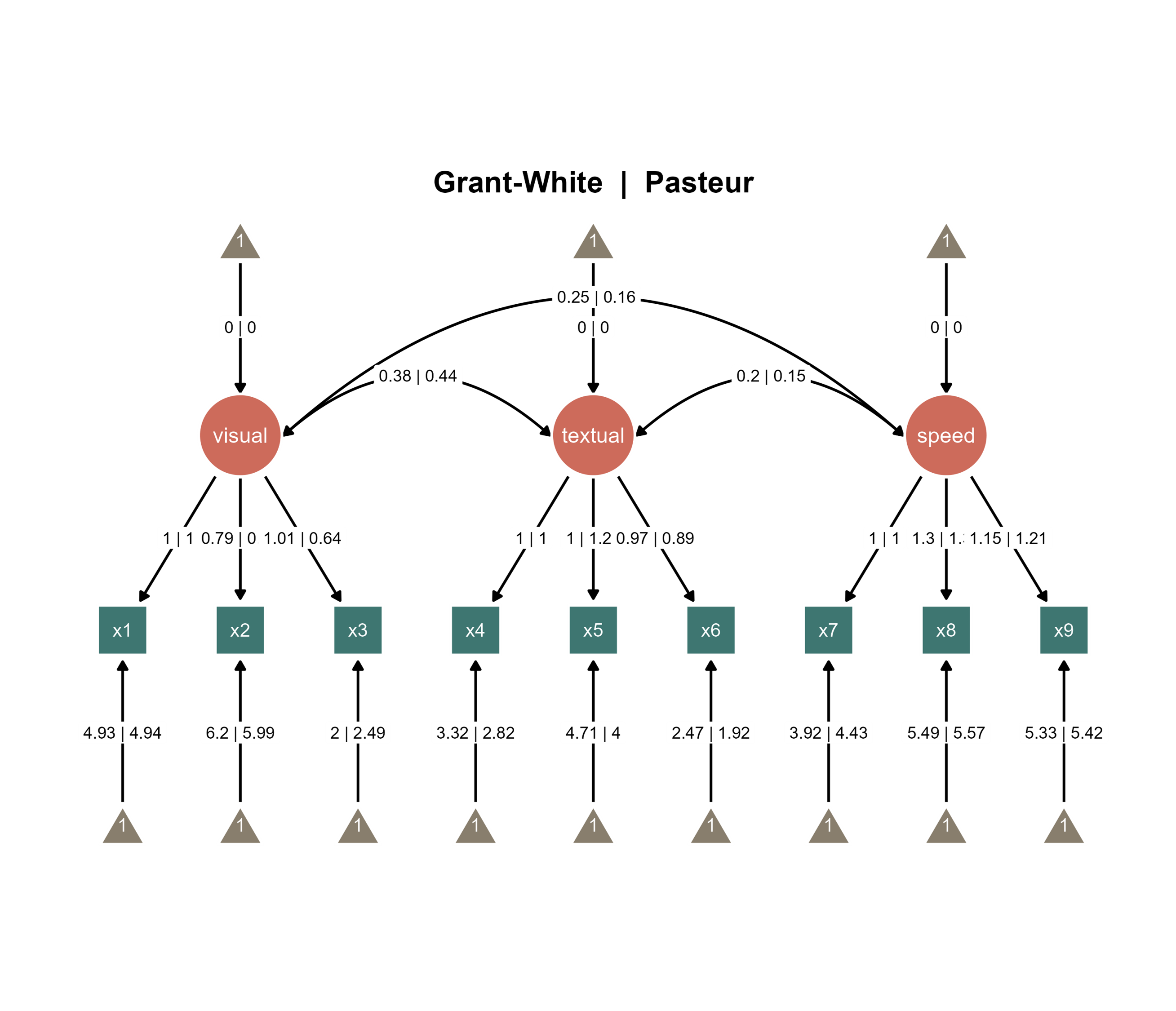 Visualization: ggsem extracts group-specific Bayesian parameter estimates from the multi-group model, arranging the Pasteur school visualization on the left (x = -35) and Grant-White on the right (x = 35).