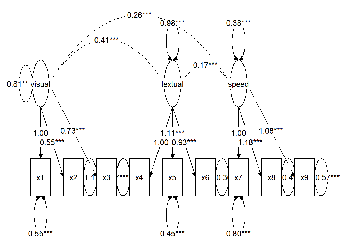semPlot object.Now, we modify the layout using functions from the semptools package.