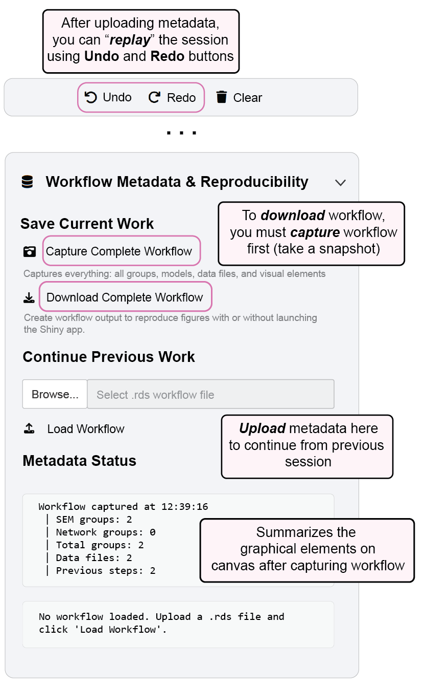 Additionally, you can save the entire metadata from one session of the app by clicking Capture Complete Workflow, and then Download Complete Workflow. This metadata can be converted into a ggplot object using metadata_to_ggplot().