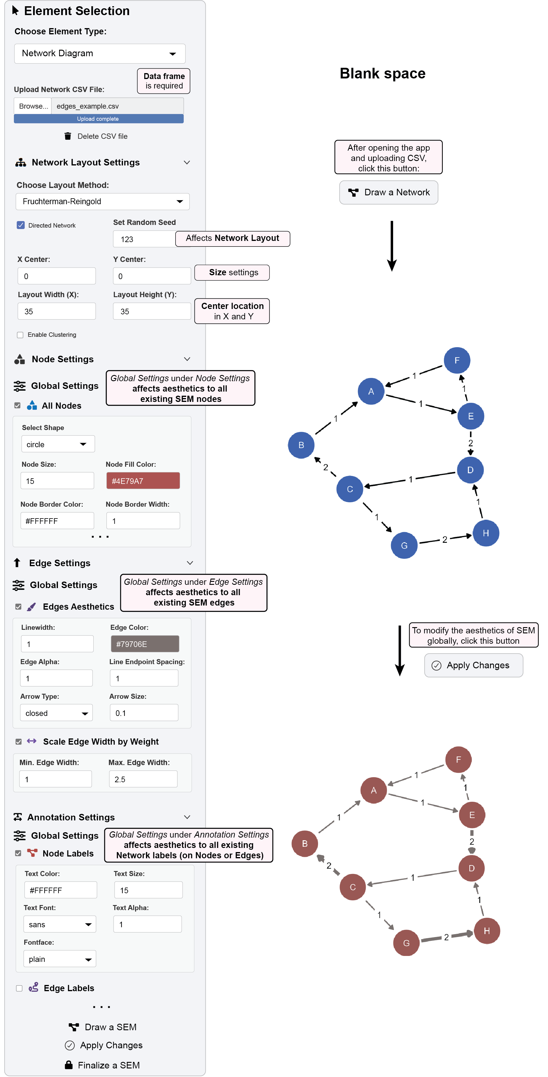 The ggsem application provides a structured, three-stage workflow for creating, customizing, and finalizing network diagrams.
