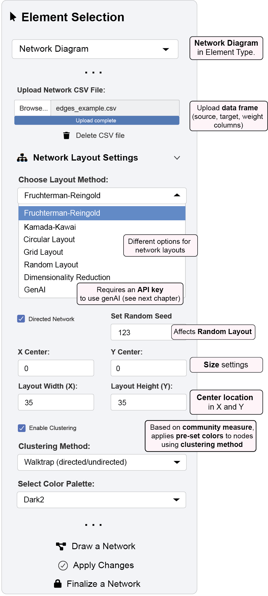 The Network Diagram menuin ggsem provides a comprehensive environment for creating, customizing, and visualizing network data with interactive parameter control that bridges network analysis and visual design.