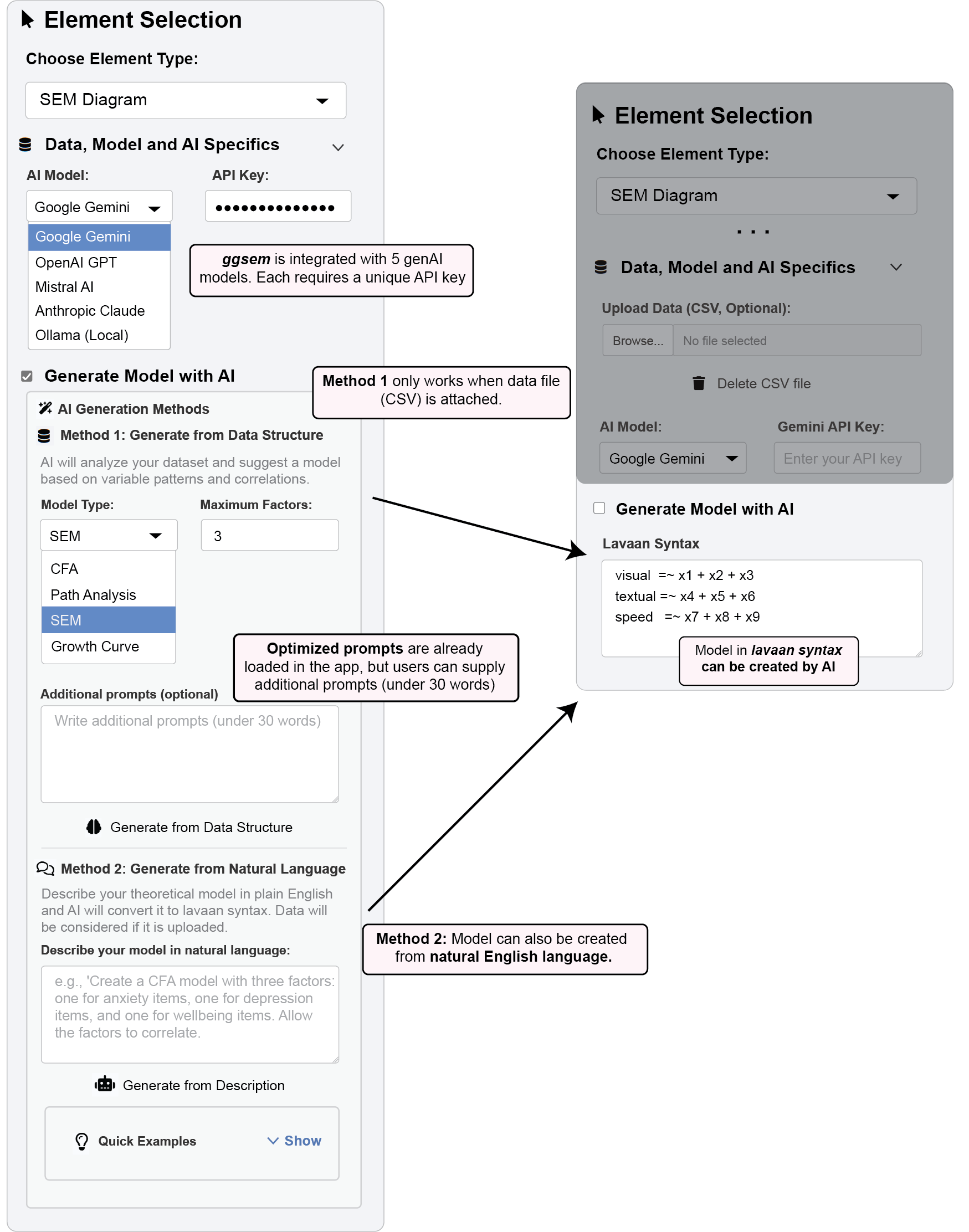 The ggsem AI Assistant provides two powerful methods for creating Structural Equation Models: generating model syntax from your data structure or from natural language descriptions. This feature makes SEM accessible to beginners while accelerating workflow for experienced researchers.