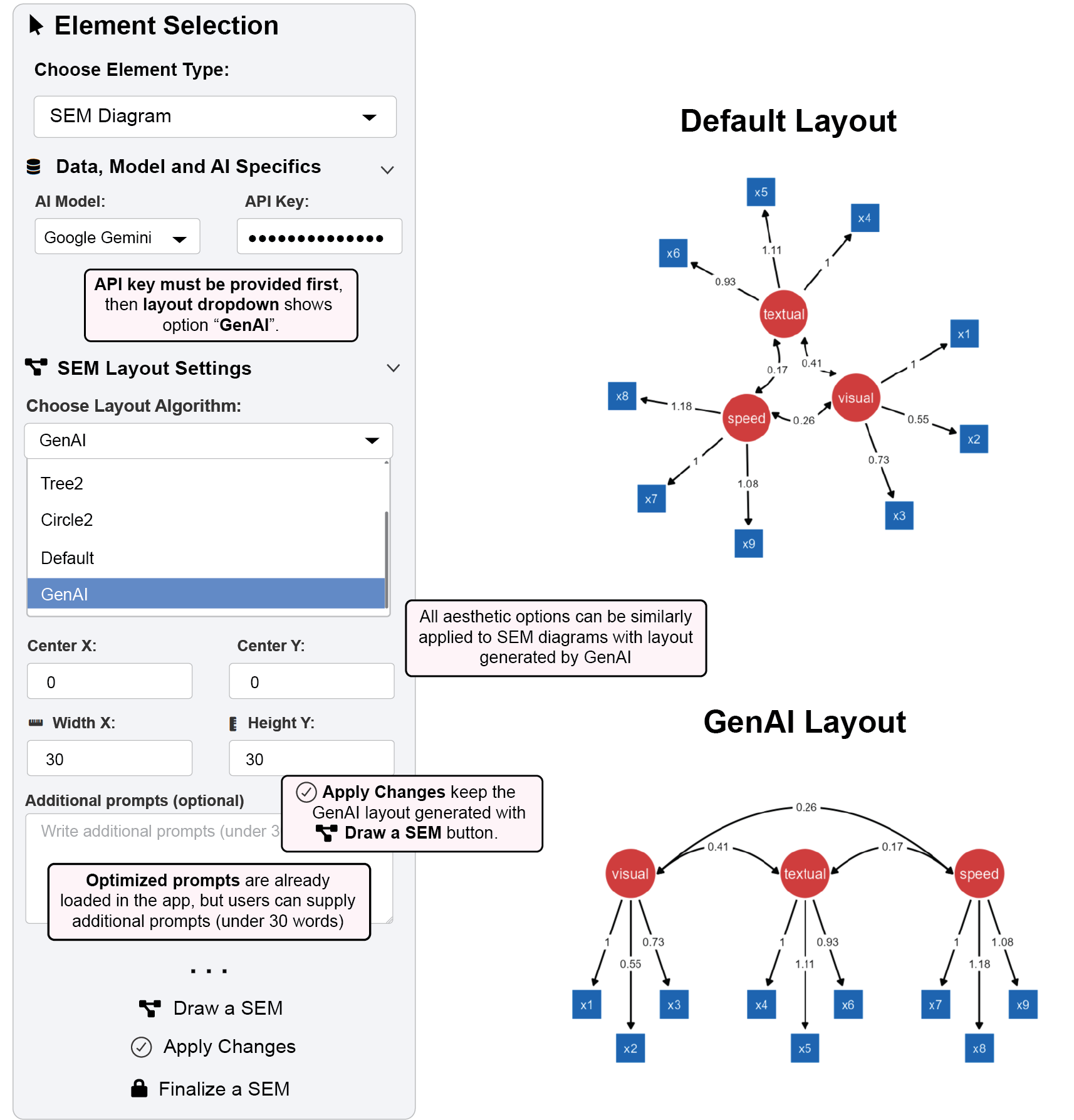 Click the “Draw a SEM” button. The AI will generate and render a novel layout for your diagram. Important: GenAI layouts are non-deterministic. Running it again will likely produce a different arrangement.