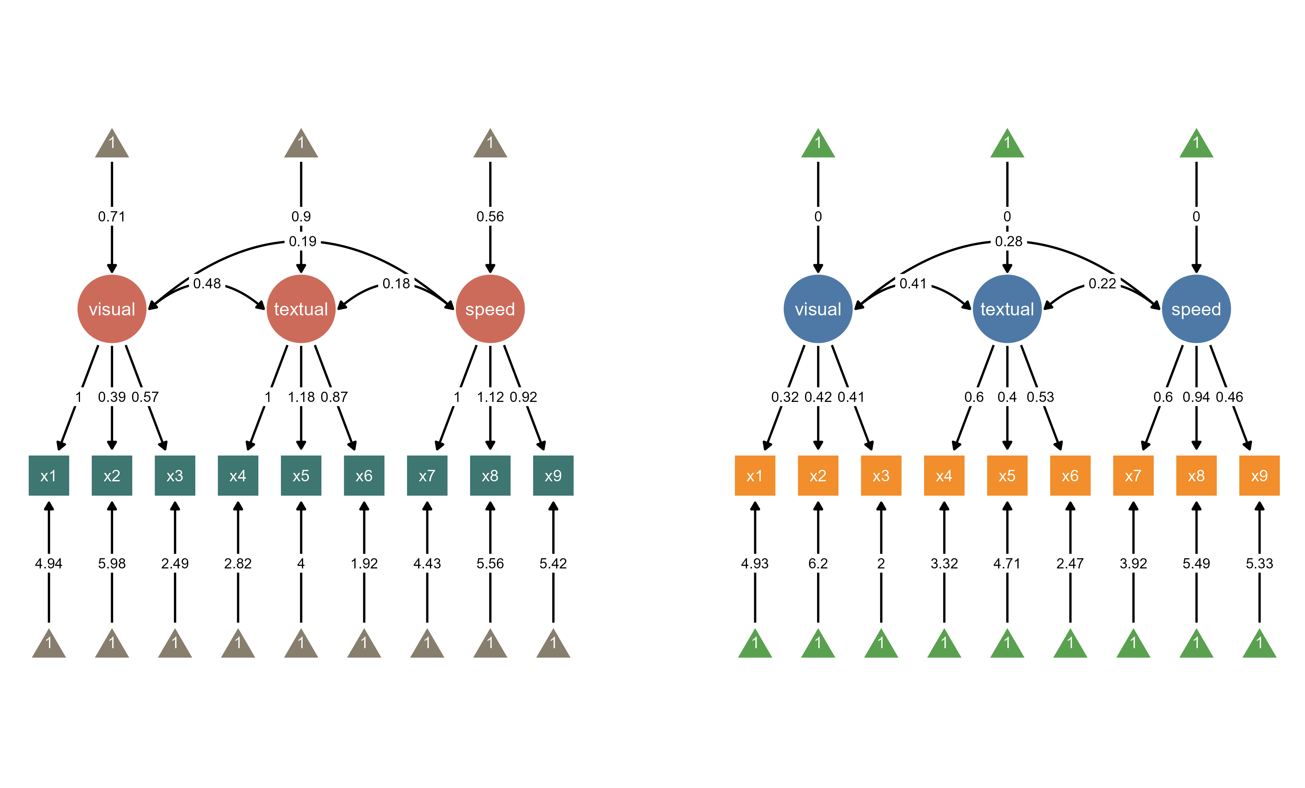 The multi-group analysis feature in ggsem allows you to compare structural equation models across different populations or conditions. This powerful functionality enables testing measurement invariance and examining how structural relationships vary between groups.