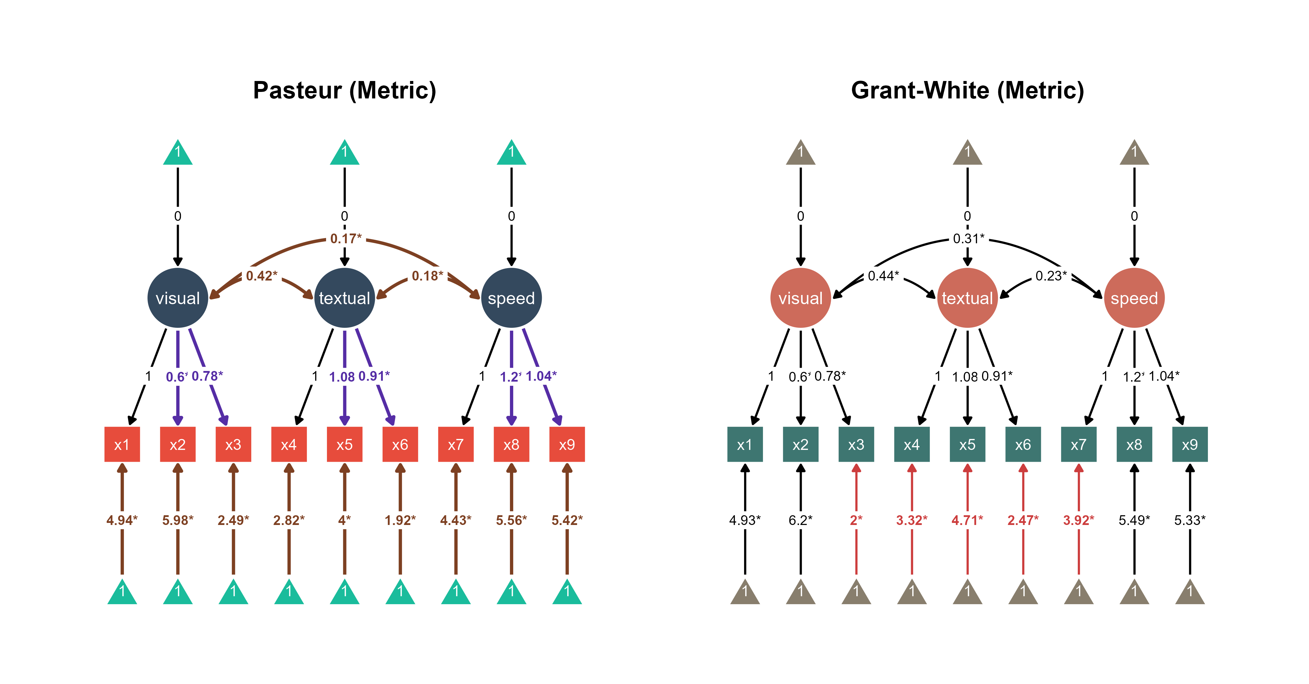 This example demonstrates how to visualize a SEM diagram for just one group (e.g., Pasteur school) from a multi-group dataset, using the group management system to isolate and customize specific groups.