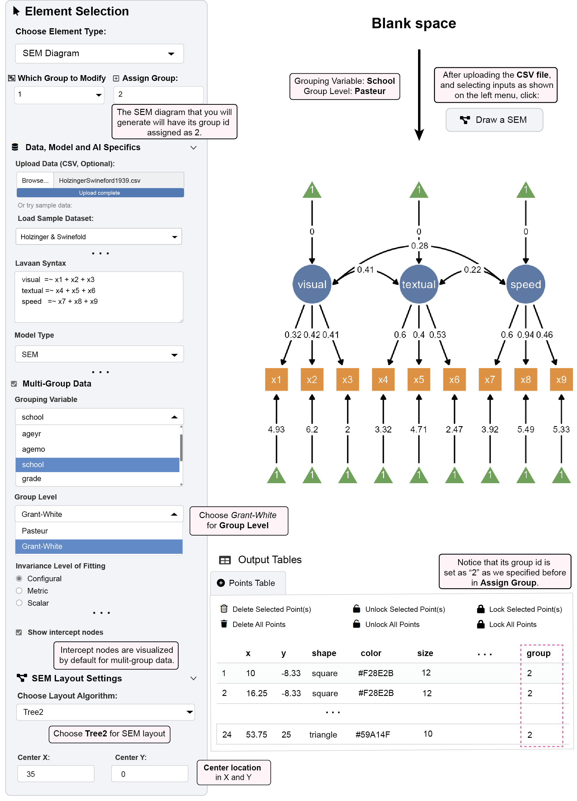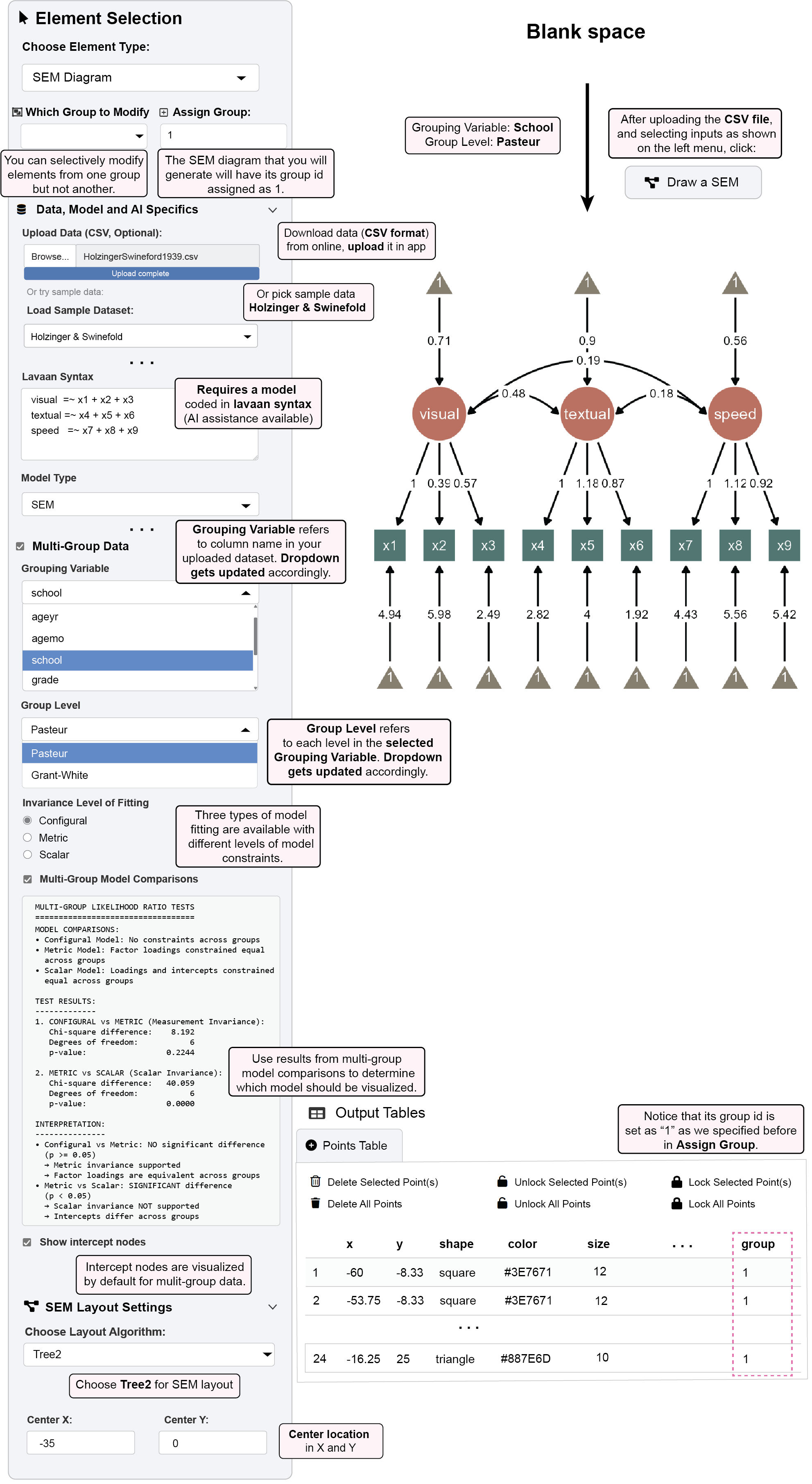 The multi-group functionality enables analysis of structural equation models across different population subgroups within a single dataset. Users can specify a grouping variable from their data and select individual group levels to visualize. Each group is assigned a unique identifier that allows for independent customization of visual properties including node colors, sizes, and layout preferences.