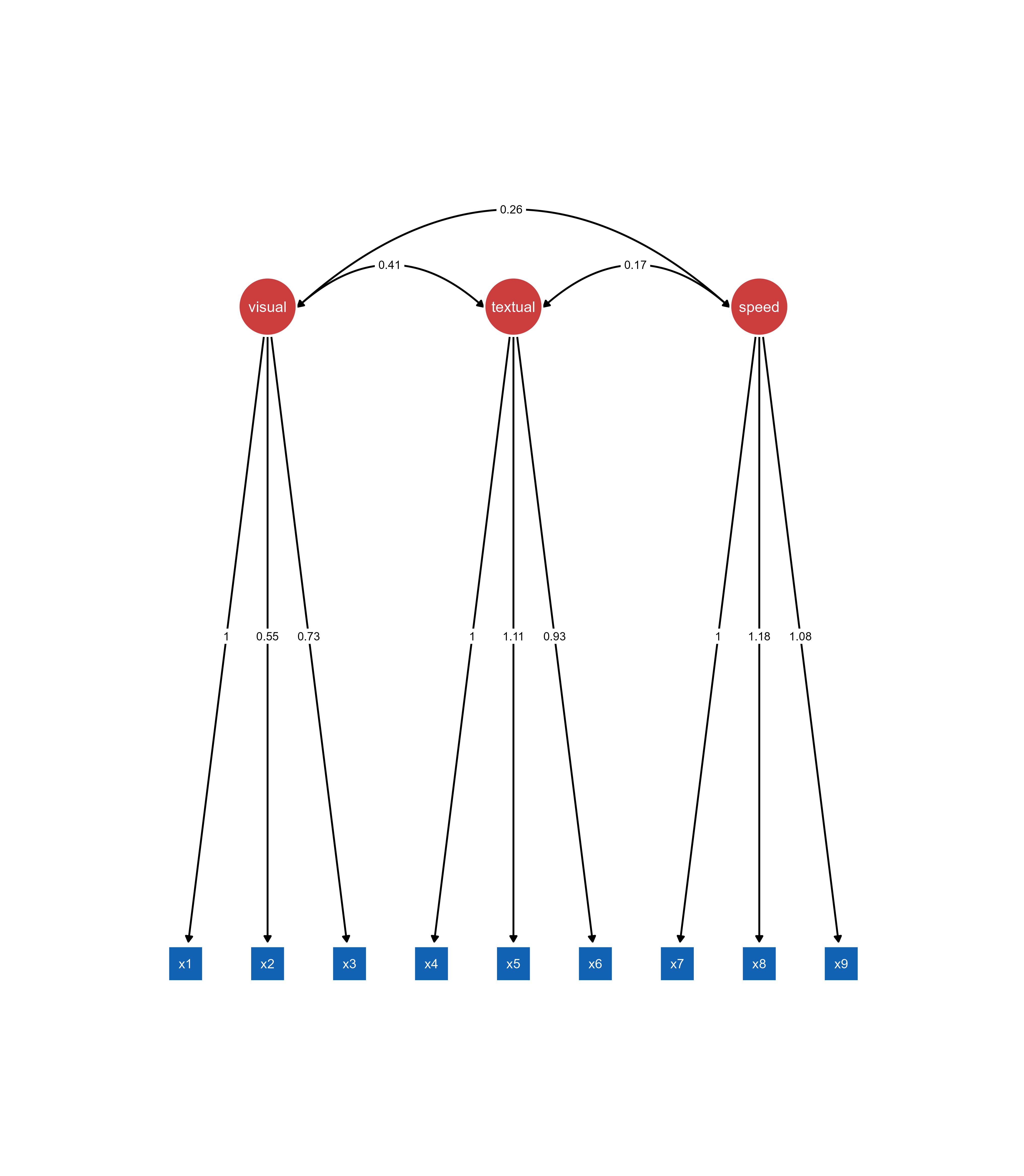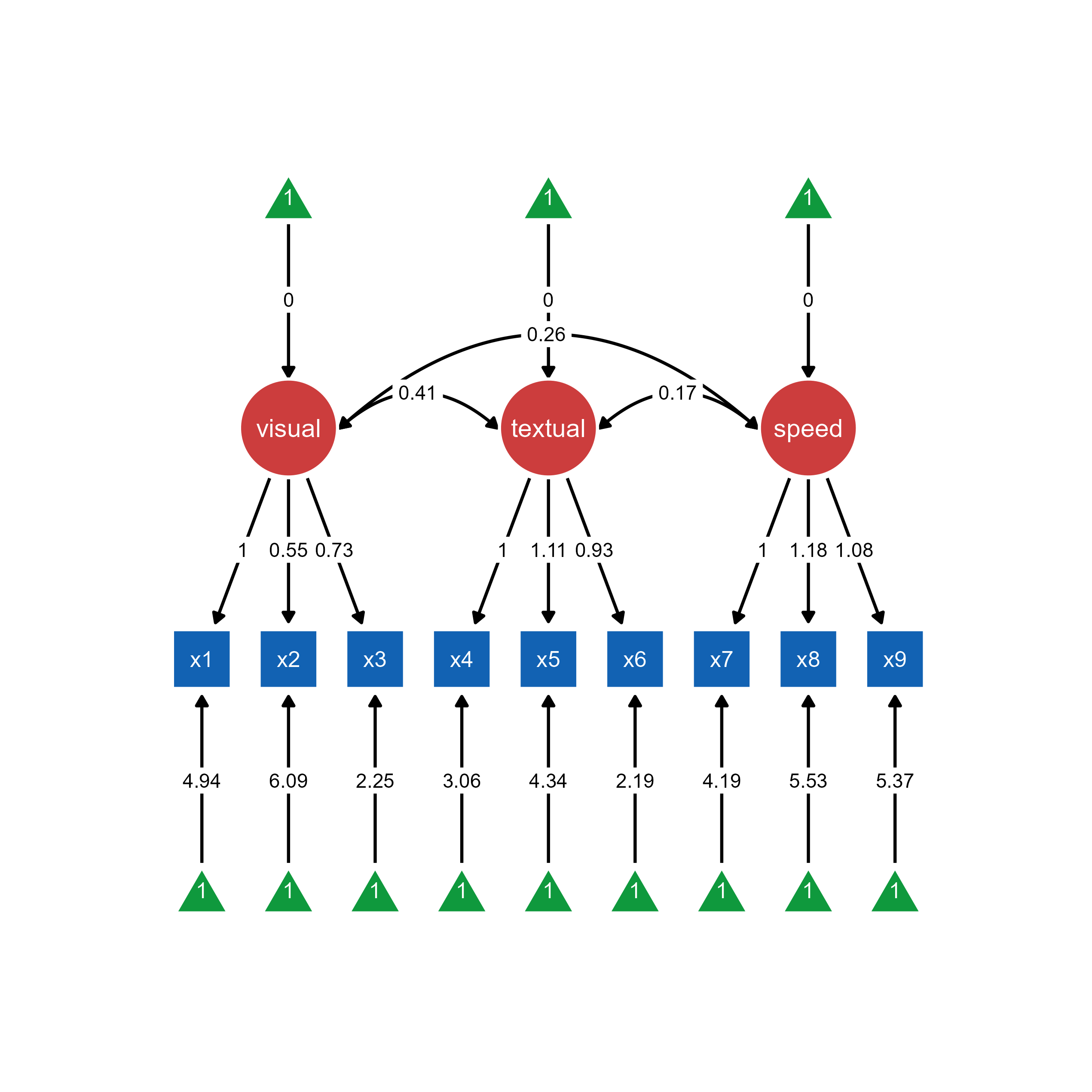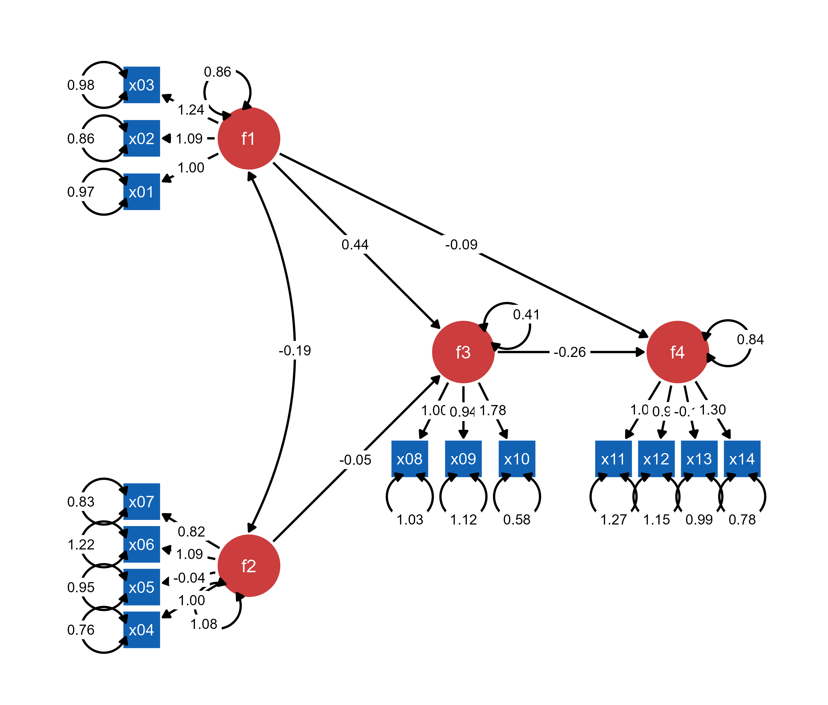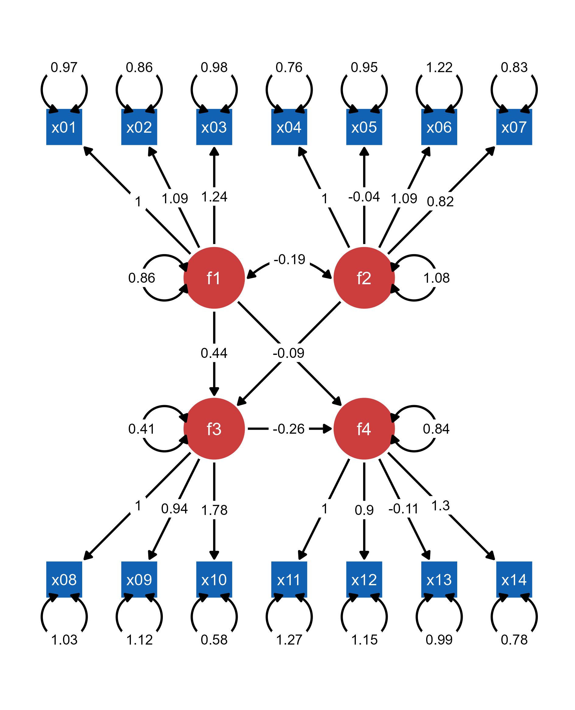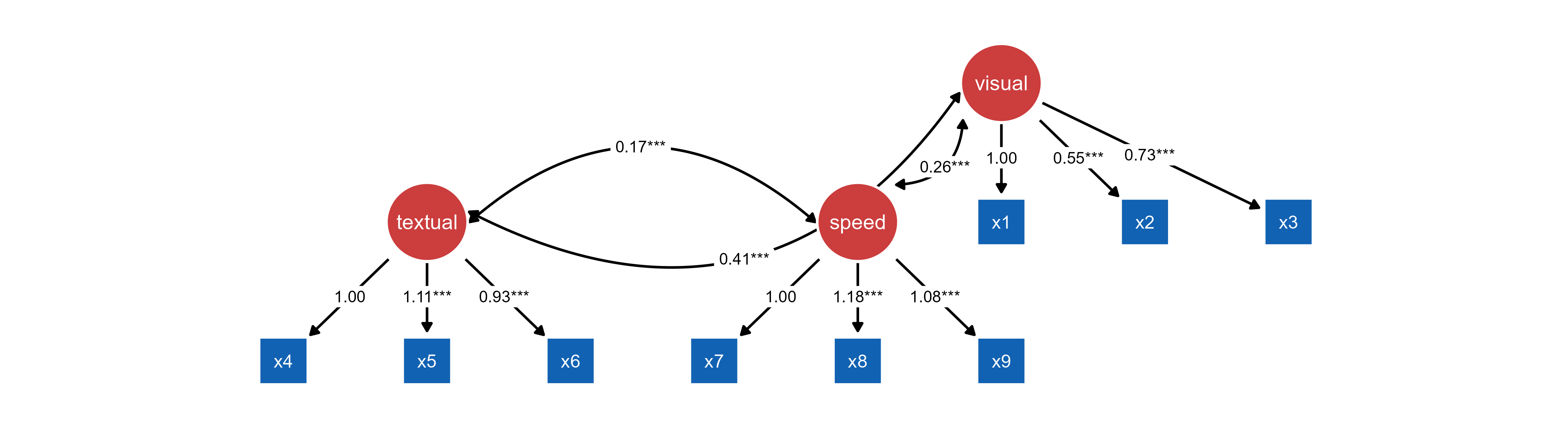semPlot object.Now, we modify the layout using functions from the semptools package.