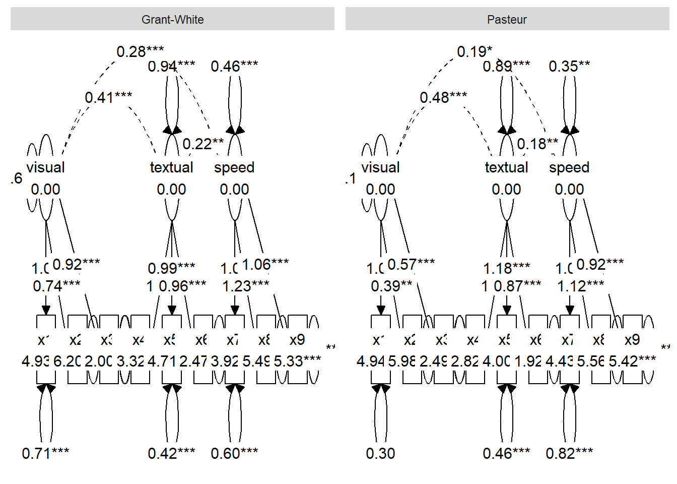 ggsem_builder(type ='sem') |>add_group('Pasteur', model = fit_multi, object = graph_pasteur, y =20, level ='Pasteur') |>add_group('Grant-White', model = fit_multi, object = graph_grantwhite, y =-20, level ='Grant-White') |>launch()