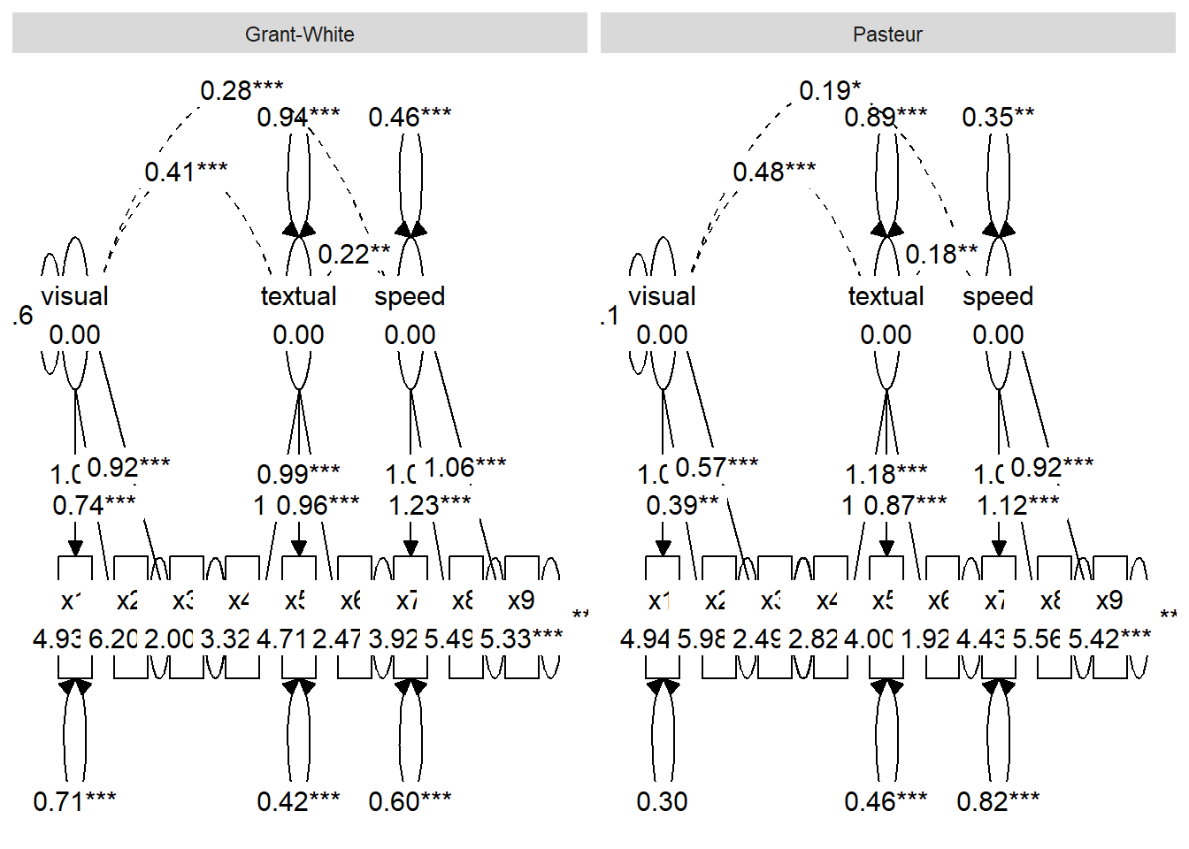 ggsem_builder(type ='sem') |>add_group('Pasteur', model = fit_multi, object = graph_pasteur, y =20, level ='Pasteur') |>add_group('Grant-White', model = fit_multi, object = graph_grantwhite, y =-20, level ='Grant-White') |>launch()